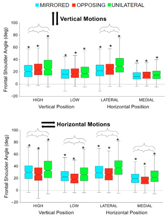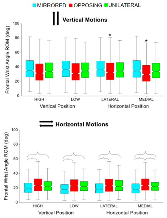 Frontal wrist angle range of motion for vertical and horizontal movements comparing task position and movement level. The * symbol indicates a significant difference between metrics due to the vertical or horizontal position within a movement level, e.g., between unilateral high and unilateral low. Brackets indicate a significant difference between movement levels, e.g., between unilateral high and mirrored high.