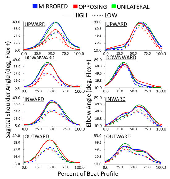 The sagittal shoulder flexion/extension trajectories during each beat profile are shown in Figure 8 left column. Trajectories highlight that shoulder flexion tends to peak before the beat for downward tasks, after the beat for upward tasks, and roughly at the beat for inward and outward tasks (the beat being at 50%). However, all cardinal movement task directions still resulted in kinematic trajectories that are generally bell-shaped. Compared to low targets, high targets consistently resulted in more exaggerated sagittal plane shoulder behaviors.