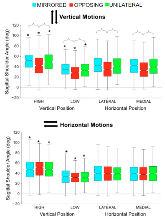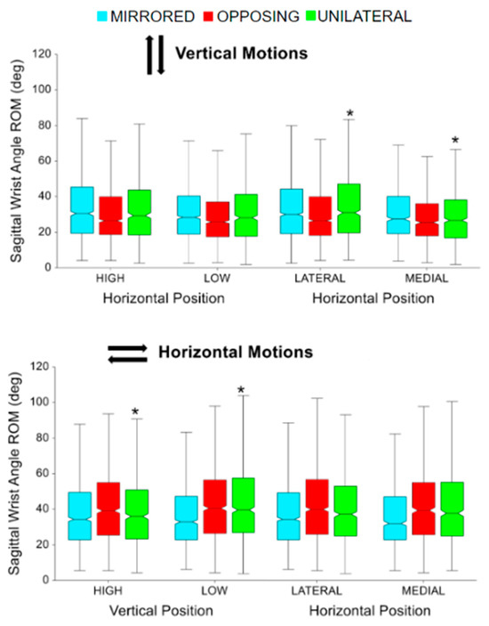 Sagittal wrist angle range of motion (ROM) for vertical and horizontal movements comparing task position and movement level. The * symbol indicates a significant difference between metrics due to the vertical or horizontal position within a movement level, e.g., between unilateral high and unilateral low. Brackets indicate a significant difference between movement levels, e.g., between unilateral high and mirrored high.