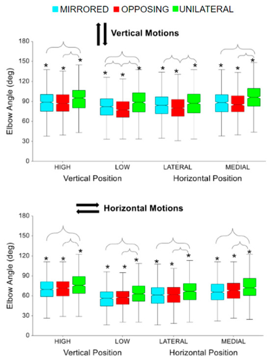 Peak elbow flexion for vertical and horizontal movements comparing task position and movement level. The * symbol indicates a significant difference between metrics due to the vertical or horizontal position within a movement level, e.g., between unilateral high and unilateral low. Brackets indicate a significant difference between movement levels, e.g., between unilateral high and mirrored high.