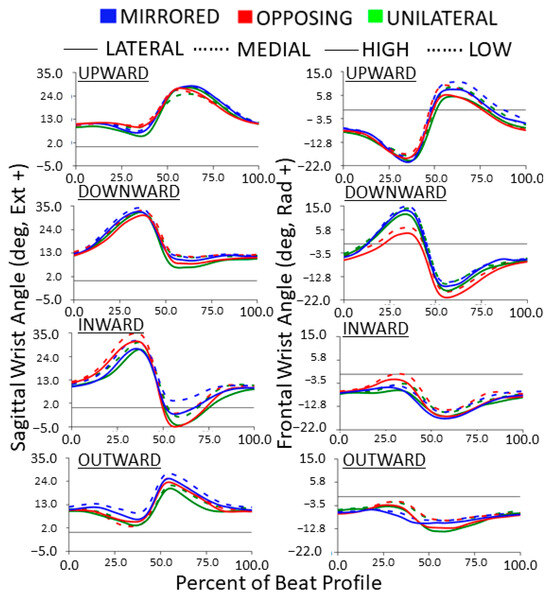 Wrist joint angle trajectories normalized to the beat profile. Columns show sagittal (extension/flexion) and frontal (radial/ulnar deviation) wrist joint angles. Rows show cardinal movement task direction. Movement levels are shown by line color. For the left column, horizontal task position and for the right column, vertical task position, shown by line style.
