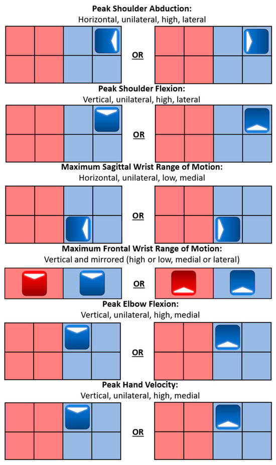 Velocity results from the XSens IMU system allowed for validation of the task performance, specifically that participants maximized their hand velocity in the target movement task direction at or near the task, indicated by the song beat, while simultaneously holding their off-axis hand velocity near zero. Participants’ upper extremity limb segment orientation data from the IMU system allowed for kinematic calculations to characterize the UE joint angle motions, or UE joint workspace, for each movement task factor. Movement tasks were presented as target blocks that the participant was instructed to make a slicing motion through in the indicated arrow direction on each target block. Movement tasks were paced at consistent intervals with the task timing to make the slicing motion through the target block with the beat of the music. Horizontal tasks were found to increase shoulder abduction and wrist flexion, as well as decrease wrist extension. Vertical tasks were found to increase shoulder flexion, wrist radial deviation, wrist ulnar deviation, and elbow flexion. The further the target was from the shoulder joint center, the more shoulder flexion and abduction occurred, for all cardinal movement task directions. Mirrored and unilateral movement levels often exaggerated joint angles, while opposing movement levels muted the metrics. These characterizations are important to physical therapists since often the goal of task-specific training is to increase the range of motion for specific joints and body limb segments [14,15,23]. A summary of the specifications that lead to the largest motion for each metric can be seen in Figure 14.