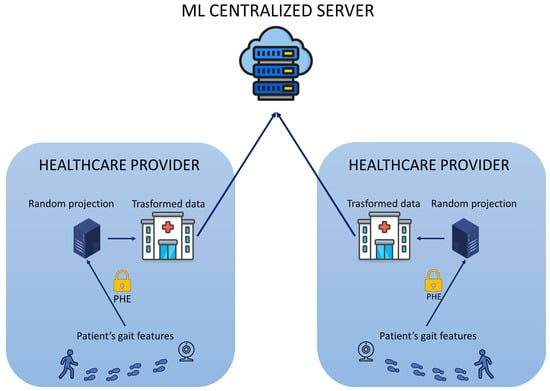 Figure 1 depicts the overall model of an early dementia recognition system through gait analysis. Figure 1 shows how the proposed hybrid protection scheme is integrated into the healthcare application. The first part includes the preprocessing of the raw data (video) to obtain the features of the patient’s gait. Coordinate extraction from the videos, sequence creation, Kalman smoothing, and feature extraction were performed to obtain the patient’s gait feature vector. The second phase consists of sending the patient’s data to the healthcare provider server to perform the random projection. The healthcare provider server can potentially be exposed to several attacks or be a secure but nosy server. Patients have no interest in their health data being available to anyone other than their physician. Therefore, the proposed hybrid protection scheme implements the PHE scheme of Paillier to ensure secure communication between the client and the healthcare provider server and secure execution of random projection within the server. After the random projection, the transformed data are stored securely in a centralized database accessible from any hospital, and they can be sent to the ML centralized server without reverting to their original form. There are two possible scenarios: different patients go to different hospitals, or the same patient goes to different hospitals. In both scenarios, the private key is in the exclusive ownership of each hospital department client and is not accessed or shared with other entities. This is fine for the first scenario but could be a problem for the second. However, the result of the decrypted random projection with different private keys will still be the same, starting from the same patient’s data. Hence, the transformed feature vectors of the same patient achieved by different hospitals can be compared for further and different evaluations without the need to share keys among healthcare departments. The following section details the preprocessing and feature extractor phases to understand the biometric data domain to be protected, and subsequently, the proposed hybrid protection scheme is described in detail.