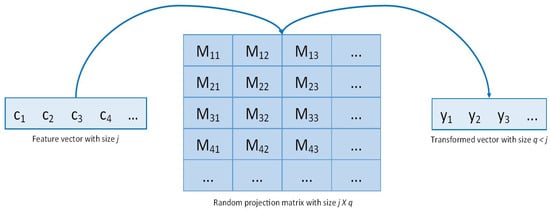 where is the encrypted transformed vector achieved after random projection in the encryption domain, and c and M are the encrypted feature vector and the random projection matrix, respectively. In the proposed scheme, a Gaussian random matrix was used as a random projection matrix. The Gaussian random matrix is typically used in Gaussian random projection to reduce the data dimensionality, and its components are extracted from the following distribution: []. The advantage of adopting the Gaussian random matrix is to guarantee a high embedding quality []. The random matrix’s column number defines the transformed vector’s size, while the row number is equal to the original feature vector length. Given the matrix M of size where , the original feature vector of length j is projected into a transformed feature vector of length q. A hyperparameter q of very small size compared with j allows a shorter random projection execution time but impacts the system accuracy that uses the transformed vector as input. In fact, in the random projection, the feature vector is projected into a transformed vector with smaller sizes []. This property makes the random projection noninvertible, as detailed in the noninvertibility analysis in Section 4. The Gaussian random matrix is generated through a pseudo-random number generator to ensure the use of the same matrix for each user. A visual representation of the random projection approach is shown in Figure 2. In summary, for each patient, the encrypted gait feature vector is transformed according to Equation (4), and the result is in the cipher domain. Before sending the transformed vector to the ML centralized server, it is necessary to decipher the result following Equation (5). The decryption process does not lead to any security issues because the result is the transformed vector from which the original feature vector can no longer be retrieved.