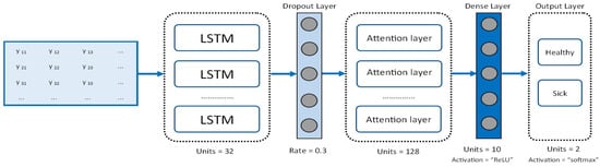 The LSTM neural network is used for early dementia recognition from transformed patients’ gait data. The choice of implementing the LSTM model is not an essential requirement for the operation of the proposed scheme. The transformed data by the proposed scheme can be used as input in any ML algorithm. The LSTM model is implemented in the centralized ML server without any threat to patients’ privacy because data have been previously protected by the proposed hybrid protection scheme. The neural network architecture consists of an LSTM layer with 32 units, a dropout layer with a dropout rate of 0.3, an attention layer, a dense layer with a ReLU activation function, and a dense output layer with a softmax activation function. The dense layer placed after the attention has a unit number of 10 with L1 regularizer with a value of 0.002 and ReLU activation function; the last layer has two units with a softmax activation function that returns a probability vector. The RMSProp optimizer was used, which implements the RMSProp algorithm, an adaptive optimization method []. The binary cross-entropy function was used as the loss function to minimize the classification error for the training examples. In this implementation, the score function was computed as in Equation (7). The LSTM model architecture is illustrated in Figure 3.