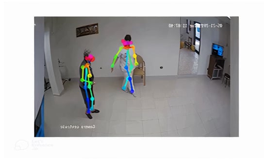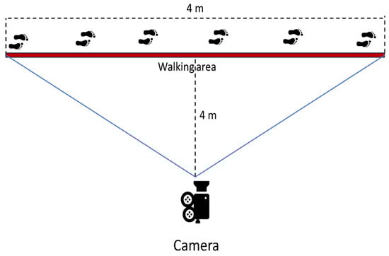 The dataset used in this work includes 118 videos, each of different lengths. The videos were taken at different times and in different hospitals. The dataset includes 43 subjects, of which 23 are healthy controls and 20 patients are affected by a dementia diagnosis by a physician. The dataset contains 2 to 3 videos for each patient. More specifically, 64 videos include healthy control subjects, and 54 videos include patients with dementia. Each subject is filmed laterally, and each subject walks from right to left (or left to right), stops, and retraces the same path in the opposite direction. The inclusion and exclusion criteria of the healthy controls and patients are based on the specific diagnosis, age, stage of the disease, and correct execution of the task, as shown in Table 2. Data collection was performed by a camera placed perpendicularly 4 m from the track to walk. The track to walk is represented by a straight line of 4 m traced on the floor. The setup of the data collection process is shown in Figure 4. Moreover, an actual human image of a subject participating in the video capture and preprocessing processes is shown in Figure 5.