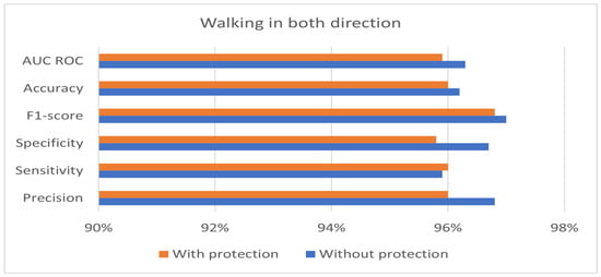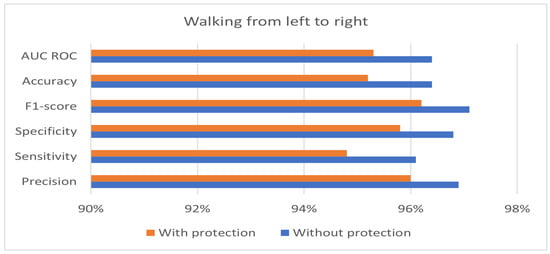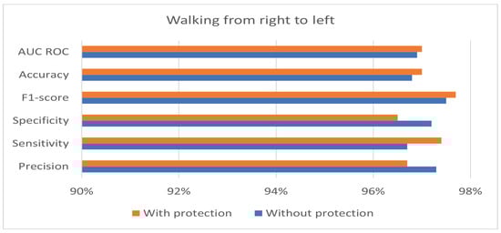 The private and public keys used in the experiment have a length of 128 bits. Table 4 shows the best performance of the hybrid protection scheme in the case of walking from right to left. Moreover, the results in Table 4 show that the proposed hybrid protection scheme has a very limited impact on system performance compared with the unprotected system. The performance differences between the use of the hybrid protection scheme and without its use are shown in Figure 6, Figure 7 and Figure 8 based on the patient’s walking. Figure 6, Figure 7 and Figure 8 show that the differences in performance are limited between the protected and unprotected systems. The accuracy degradation is at worst 1.20% in the case of walking from left to right. In all other cases, the accuracy difference is under 1%.
