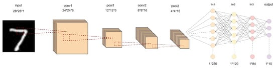 The structure of the LeNet-5 neural network is shown in Figure 1. The input feature map has a size of 28 × 28 × 1, totaling 784 pixels.