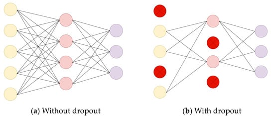 A schematic diagram comparing the network structure before and after adding dropout in the fully connected layer during forward propagation is shown in Figure 2. Dropout randomly deactivates a portion of neurons with a certain probability P during the forward propagation phase. The purpose of dropout is to prevent network overfitting, enhance the network’s generalization performance, and improve its recognition accuracy.