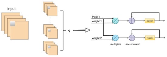 Loop unrolling for output feature maps was achieved by parallelizing the computation of convolutional kernel weight parameter values and the pixel values from one input feature map, performing multiply–accumulate operations in each clock cycle, as illustrated in Figure 3 ().