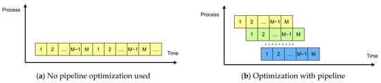 As shown in Figure 4a, it represents a basic loop with M operations and iterations. If each operation in the loop takes one clock cycle, the total latency of the entire loop is M × N cycles. This structure uses the fewest resources but has the longest execution time. Figure 4b illustrates an ideal pipeline structure with stages. The pipeline stages can work simultaneously, but they require a certain amount of storage resources. The throughput of this pipeline architecture was calculated as shown in Equation (7).