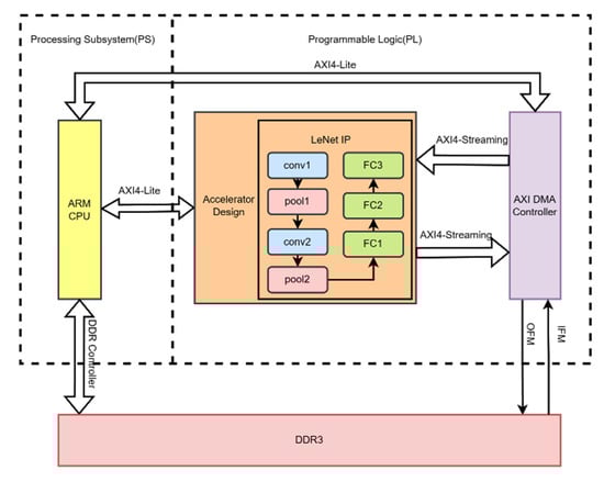 This project is based on the development of Zynq, which consists of two parts: the processing system (PS) side and the programmable logic (PL) side. The overall architecture design is shown in Figure 6. From the diagram, it can be seen that image data are stored in the DDR3 memory on the PS side, while the entire LeNet-5 convolutional neural network is implemented in the PL side. The LeNet neural network is further divided into convolution modules: pooling modules and fully connected modules. The flow of image data starts from the PS side and is transmitted to the PL side. To obtain prediction results, the PL side needs to transmit the prediction results to the PS side for display. This approach deploys the entire LeNet-5 neural network’s logic and various layers in the PL, significantly reducing data transfer and computation time, thus reducing the overall prediction time of the neural network. The resources available on the PL side of ZedBoard are sufficient to implement the LeNet neural network, which is why this method was adopted in this design to maximize network performance.