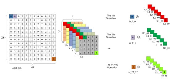 In the 6th line of code in Table 2, the UNROLL optimization statement was used to unroll the innermost for loop of the convolution operation. The C synthesis tool generated six multipliers and performed parallel computation of these six multiplication operations, as illustrated in Figure 7. In the first operation, all six elements of the first convolution kernel were taken at once, and they were multiplied by the value of the first pixel point in_0_0 in the input feature map. In the second operation, all the first row’s second elements of the six convolution kernels were taken and multiplied by the pixel value of the second pixel in the first row of the input feature map, and so on. After 14,400 operations, all the pixel points in the input feature map had undergone multiplication operations. The output feature map size of the first convolutional layer was 24 × 24 × 6, and each convolution kernel had 25 elements, so the last multiplication operation on the input feature map’s last pixel with the last element of the convolution kernel was located at 24 × 24 × 25 = 14,400. The code optimization principle in the 12th line of Table 2 is the same, but it performed addition operations on each pixel point in the output feature map instead of multiplication. The same optimization approach was used for the convolution computation in the C3 layer.