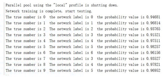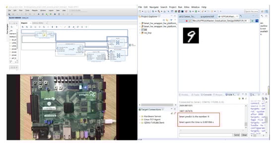 After model training, we added the weight information to the Vivado SDK project in the form of an a header file. We implemented the inference process of the LeNet-5 network on the ZedBoard development platform, and the results are shown in Figure 9. We analyzed the effectiveness of the proposed optimization techniques through experimental data, evaluated the resource utilization (BRAM, DSP, FF, LUT) for each optimization method, and compared the performance metrics (including computation speed and power consumption) with other computing platforms.