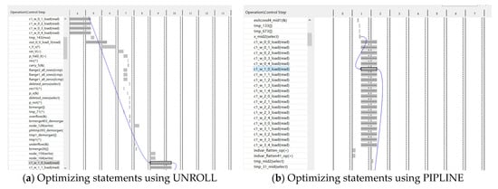 Figure 10 demonstrates the data processing process of the for loop after using UNROLL and PIPELINE optimization statements. Variables ending with “_load” on the left represent data read operations, while the corresponding values on the right indicate the time required for the read operation. Figure 10a illustrates the data processing process after UNROLL optimization, which revealed a time gap of more than three cycles between the read operations of data c1_w_0 and c1_w_1. Conversely, Figure 10b presents the data processing process after PIPELINE optimization, indicating that data read operations from BRAM occurred simultaneously. Hence, compared to UNROLL optimization, the PIPELINE-optimized accelerator exhibited a lower latency.