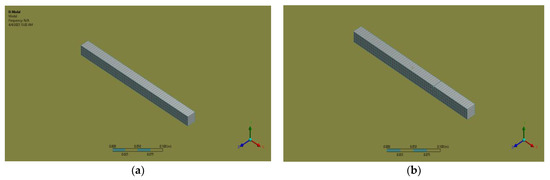 The cracked beams’ natural frequencies are estimated using the finite element program, ANSYS [35]. A small region was first created and then extruded in the third direction to introduce small cracks with depths of 0.01 m at desired locations. These minor crack volumes were then subtracted from a large cantilever beam model, resulting in three-dimensional models with cracks along the top sides of the cantilever beam. The beam was modeled using a solid structure composed of 20 nodes and 186 hexahedral elements. This choice of element type allows for an accurate representation of the beam’s geometry and behavior. Finite element boundary constraints were applied to confine all degrees of freedom at the farthest left of the beam. The natural frequencies of the beams were determined using modal analysis. The initial validation involved analyzing a theoretical uncracked beam with a known natural frequency, which was then compared to the natural frequency obtained from the ANSYS analysis of the same uncracked beam.