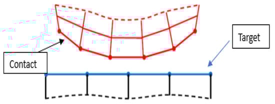 The closed crack is a nonlinear feature, making it highly recommended to use a nonlinear contact modeling approach for its analysis [37,38], as shown in Figure 3. Two options for contact modeling are frictional and frictionless. Structural analysis generates contacts in pairs. Three available contact behaviors exist surface-to-surface, node-to-node, and node-to-surface. In a frictional contact model, the friction coefficient is greater than zero, leading to slipping along the contact surface when the tangential force reaches a certain threshold. In the frictionless contact model adopted in this paper, the friction coefficient is equal to zero, and the tangential force and loading path are independent. The calculation method is a pure penalty function and surface-to-surface contact is used, meaning that both the contact and the target are surfaces, with the contactor elements unable to penetrate the target surface but capable of doing so with the contactor surface.