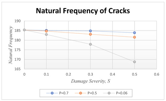 Cracked beams at different crack locations and depths are considered in the analysis. Figure 4 depicts the natural frequency for different crack depths (S = 0.1, 0.3, and 0.5) and the crack locations (P = 0.06, 0.5, and 0.7). The table in the study indicates that the natural frequency decreases as the crack approaches the fixed end. Conversely, when the crack is farther from the fixed end, the natural frequency is closer to that of the intact beam. The depth of the damage also affects the natural frequency, as increasing the damage depth decreases the natural frequency at the same crack location. Figure 4 illustrates that the frequency increases are more significant as it approaches the free end. As the crack position moves away from the fixed end, the frequency drops and eventually reaches the frequency of the health beam.