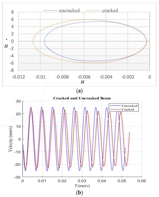 This section discusses the effects of crack parameters on the phase diagram of a cantilever beam. The crack parameters considered include the crack depth and location. The phase diagram illustrates the relationship between displacement and velocity. Figure 5 displays the phase graphs for the cracked beam and the entire beam under the principal resonance frequency. Equation (2) was used to determine the excitation frequency at the beam edge’s end. According to the findings in Figure 5a, the uncracked beam is wholly circular in contrast to the cracked beam. Figure 5b demonstrates the acceleration with time response for a cantilever beam that is both uncracked and cracked. The results show that the crack has a significant effect on the phase diagram.
