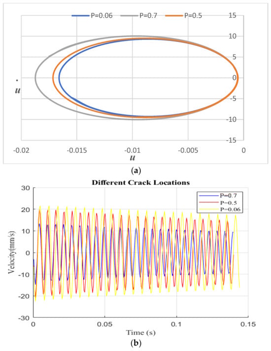 Figure 6 illustrates the impact of crack location on the cantilever beam with a fixed crack depth of S = 0.3. Three different crack locations, P = 0.06, 0.5, and 0.7, were considered. As shown in Figure 6, the crack becomes more visible and the displacement value increases when it is closer to the fixed end. Conversely, when the crack is located farther from the fixed end or closer to the free end, the displacement decreases and the damage becomes less apparent. Figure 6a displays phase diagrams for different crack parameters under the primary resonance frequency. The phase diagram exhibits a single loop as its path. These phase diagrams were created to visualize the impact of different crack locations on the behavior of the beam under the primary resonance frequency. The results show that crack location is an important factor to consider when analyzing the behavior of the cantilever beam’s phase response.