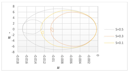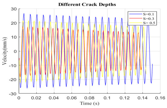 Figure 7 demonstrates the effects of crack depth for specific crack locations by displaying variations in displacement versus velocity under various damage severities (s = 0.1, 0.3, and 0.5) at a fixed crack location of P = 0.06. As the damage severity increases, the small circle becomes more visible, indicating the significant effect of the crack depth on the structure. The phase diagram for different cracks is shown in Figure 7 and the excitation frequency is adjusted to the super-harmonic resonance frequency. Each curve has a large and tiny loop, as can be seen. This shows that both the damage location and severity are average, and it indicates that the phase diagram is an irregular single loop. This phase diagram shows a single loop for small crack depths but, for larger crack depths, two loops can be seen in the phase diagrams. This observation indicates that the vibration response of the cantilever becomes more pronounced as the crack depth increases. Figure 8 shows the velocity versus time for the same case.