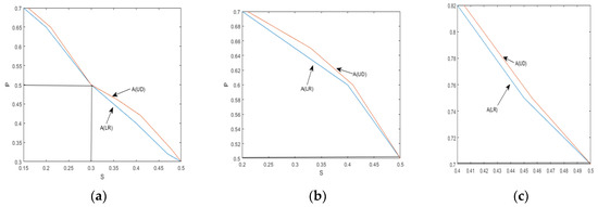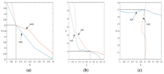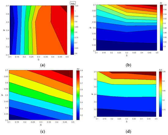 Figure 11 and Figure 12 provide visual representations of how the indices A(LR) and A(UD) depend on the crack depth (S) and location (P). These figures illustrate the changing values of the indices as the crack parameter varies. Table 2 and Table 3 further support the observation that, as the damage depth or location increases, the index A(LR) steadily increases while the index A(UD) gradually decreases. This trend indicates that the level of damage and the position of the cracks can be qualitatively estimated based on the value of one of these indices. However, it is important to note that a single index alone cannot identify a specific crack, since multiple combinations of damage parameters can yield the same contour line with the same index values. Therefore, to precisely locate the crack, it is necessary to consider the intersection of the contour lines formed by the two indices. Combining the two indices into a single figure, the contour lines intersect at a single point. The horizontal and vertical coordinates of this intersection point correspond to the crack parameters S and P, providing precise information about the crack’s depth and location. Similarly, other crack parameters can be determined using a similar approach, as depicted in Figure 10a–d. By utilizing these contour lines and their intersections, researchers can accurately identify and retrieve various crack parameters, enhancing the effectiveness of crack detection and characterization in cantilever beams.