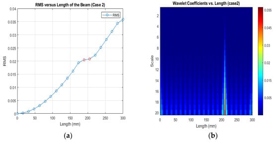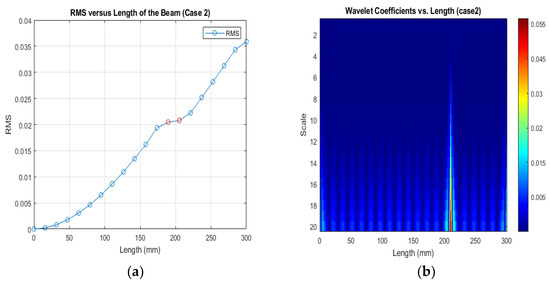 (a) RMS values under damage Case 2; (b) the wavelet coefficients for the beam under damage case 2.