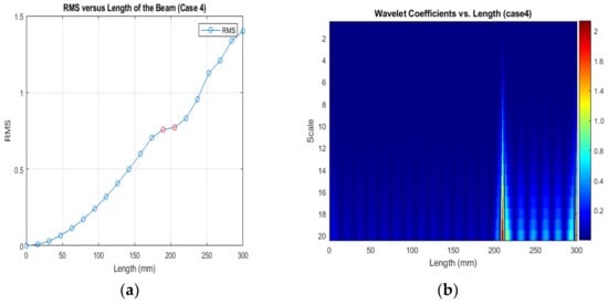 (a) RMS values under damage; (b) the wavelet coefficients for the beam under damage case 4.