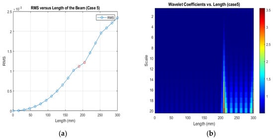 (a) RMS values under damage Case 5; (b) the wavelet coefficients for the beam under damage case 5.