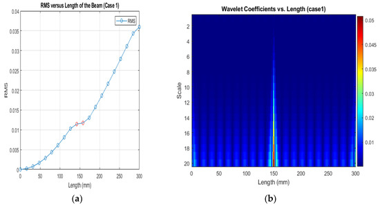 (a) RMS values under damage Case 1; (b) the wavelet coefficients for the beam under damage case 5.