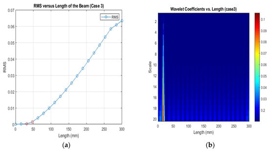 (a) RMS values under damage Case 3; (b) the wavelet coefficients for the beam under damage case 3.