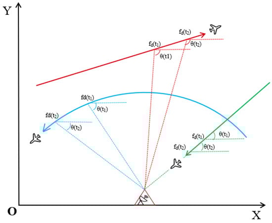 However, using the combined observations of azimuth and Doppler has certain requirements on the relative positions of the observation point and the target trajectory. In specific cases, the observation point will experience weak observation or non-observation during some relative motion periods [,], as shown in Figure 1. When a maneuvering target moves with a uniform or uniformly variable speed along the line connecting it to the observation point, both the azimuth and Doppler measurements have a rate of change of 0. During these periods, the target becomes unobservable as there is no significant change in the measured information. Similarly, when the maneuvering target follows a uniform circular motion relative to the observation point, the Doppler measurement remains constant, and only the azimuth measurement provides some observable information, this observation is considered weak due to the lack of Doppler information, which limits the accuracy of target state estimation during such periods.