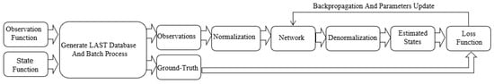 In this section, we will discuss the deep learning algorithm applied to maneuvering target tracking based on the combined observations of azimuth and Doppler. The algorithm consists of two parts: the training phase and the testing phase. The training phase is depicted in Figure 2. Following a similar research scheme for maneuvering target tracking based on LSTM or TBN [,], we begin by using the observation equations and state equations to generate a large-scale trajectory dataset (LASTD) and then employ LASTD to train the neural network model. The LASTD is first followed by batch processing, and the normalized observations are input into the designed network model batch by batch. The output of the model is the predicted maneuvering target state which is converted back to its original form before. Finally, backpropagation and parameter updating of the network are performed using a loss function with the predicted states and the ground-truth states. We fine-tune the network to improve its performance in maneuvering target tracking.