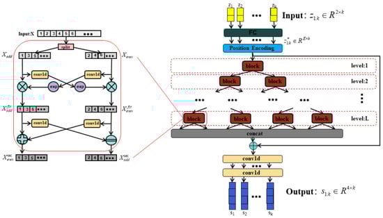 Model architecture of RDCINN. On the left is a diagram of a sub-block structure of the binary tree network architecture, which performs splitting, convolution, and interactive learning operations on the input sequence X sequentially and finally outputs the odd and even subsequences and . The input to the binary tree network is the 2-dimensional sequence of normalized observations z1:k. It is first mapped through the fully connected layer into the E-dimension and the final outputs obtained through the network as a 4-dimensional sequence of predicted target states s1:k.