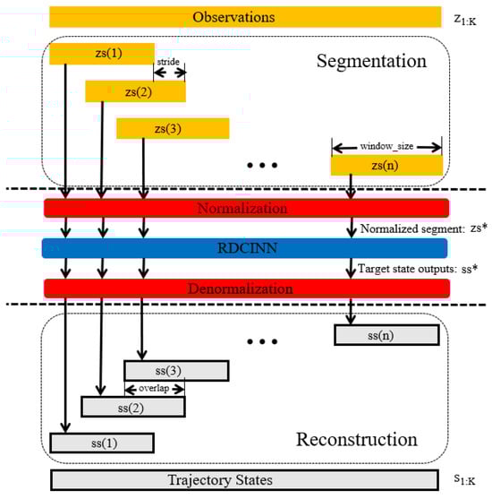 Trajectory segmentation and reconstruction consist of the following steps: Divide the observations corresponding to the target states using a sliding window approach. Normalize each segment of the observation time sequence as . Apply denormalization on the predicted target state outputs to obtain the corresponding predicted state sequence . Finally, reconstruct each segment of predicted target state sequences after denormalization.