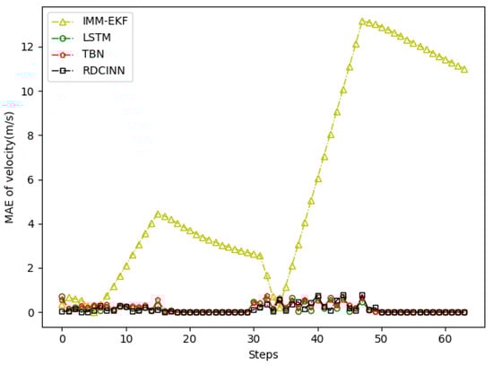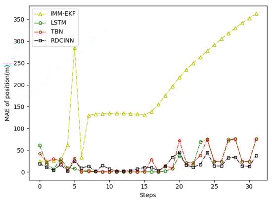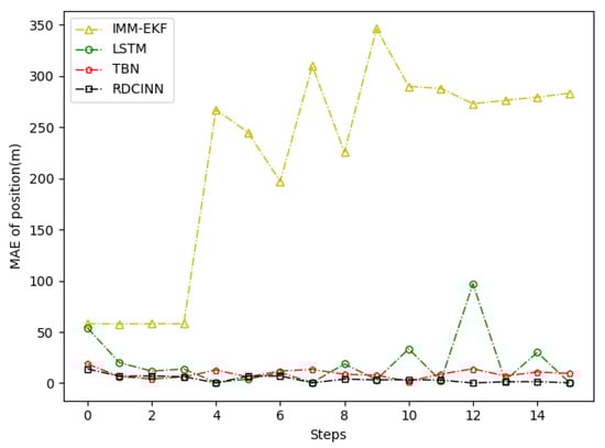 In order to verify the applicability of our network model for tracking strong maneuvering trajectories with different step sizes, we generate trajectory B and trajectory C by conducting Monte Carlo simulations. Trajectory B is a 32 s strong maneuvering trajectory with an initial state of [−8000 m, 5000 m, −30 m/s, 21 m/s]. It consists of four segments of 8 s trajectories, each with a different model. The models for each segment are as follows: uniform circular motion with a turning rate of 6°, uniform motion, uniform circular motion with a turning rate of −5°, and uniform motion, respectively. Trajectory C is a 64 s strong maneuvering trajectory with an initial state of [−5000 m, 5000 m, 30 m/s, −23 m/s]. It also consists of four segments of 16 s trajectories with different motion models. The motion models for each 16 s trajectory are as follows: uniform circular motion with a turning rate of −1°, uniform motion, uniform circular motion with a turning rate of 2°, and uniform motion, respectively. Keeping the standard deviation setup as how trajectory A was set up as the same, we then evaluate the tracking performance of trajectories B and C using our network model and three baseline algorithms. The evaluation results are presented in Table 4 and Table 5. Additionally, Figure 9, Figure 10, Figure 11, Figure 12, Figure 13 and Figure 14 provide visual representations of these results.
