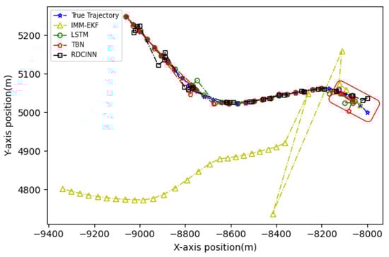 In our experiments, we compare our proposed algorithm with three existing algorithms: the LSTM network [], the TBN model [], and the traditional maneuvering target tracking method IMM-EKF []. We keep the model parameters of the LSTM network and the TBN model unchanged, as specified in their respective research papers, and train the deep learning models using the LASTD we have created.