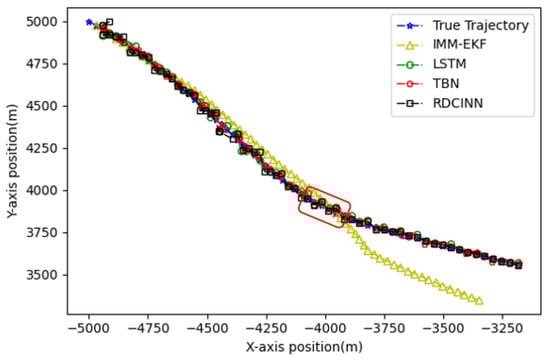 After that, we utilize Monte Carlo simulation to generate a 16 s strong maneuvering trajectory A. The initial state of A is [−4000 m, 4000 m, 50 m/s, −66 m/s]. This trajectory consists of four segments, each lasting 4 s and employing different motion models, which reflect sudden changes in the motion target states in real-world scenarios. The first segment of the trajectory is a 4 s uniform motion. The second segment is uniform circular motion with a turning rate of −7°. The third segment is also a uniform circular motion but with a turning rate of 7°. Finally, we set the last segment as a uniform motion. Additionally, we introduce azimuth observation noise as white noise with zero mean and standard deviation of 1.8°, while the standard deviation of Doppler velocity observation noise is 1 m/s. Additionally, the standard deviation of acceleration is set to 10 m/s2. To assess the tracking performance of trajectory A, we employ our own network model as well as three other baseline algorithms. Table 3 presents the evaluation results, while Figure 6, Figure 7 and Figure 8 provide visual representations of these results.