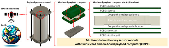 Conceptual diagram of a small satellite in LEO with an on-board payload computer and a fluidic card capable of multi-modal multi-array electrochemical and optical sensing for conducting biological experiments in space.