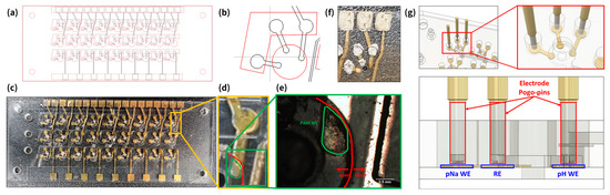Multi-modal multi-array electrode design and fabrication process. (a) AutoCAD design files (black line for electrode mask design and red line for passivation layer). (b) Close-up of a single-well with its accompanying 3 electrodes (from left to right: pNa WE, shared RE, and pH WE). (c) Photograph of pH and pNa sensor electrode array after Cr and Au deposition. (d) Close-up of a single pH WE before electropolymerization. (e) Close-up photograph of a PANI-electropolymerized pH WE. (f) Close-up photograph of a single-well and its 3 electrodes with Ag ink layered on top for protection. (g) Three-dimensional CAD model of pogo-pins making contact with the pogo-pin pads of the electrode layer.
