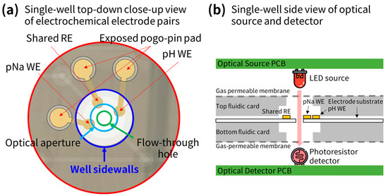 Furthermore, the multi-array sensor needs to connect with the source PCB, positioned right above the fluidic card. To effectively monitor the pH, pNa, and absorbance in each well, the sensor includes a pH-sensitive working electrode (WE), a pNa WE, and a shared reference electrode (RE). For optical measurements, an optical source (red LED, model no. KT-0603R, Hubei KENTO Electronic Co., Ltd., Yichang, China, typical emission wavelength at 620 nm [44]) is located on the source PCB above each well, and an optical detector (CdS photoresistor, model no. GL5537, Senba Sensing Tech, Nanyang, China, with peak 100% relative sensitivity at 540 nm and 80% relative sensitivity at 620 nm [45]) is located on the detector PCB beneath each well. Figure 4a,b provide a conceptual illustration of a single well, displaying the arrangement of the electrochemical electrodes (top-down view) and the optical absorbance sensor (side view).