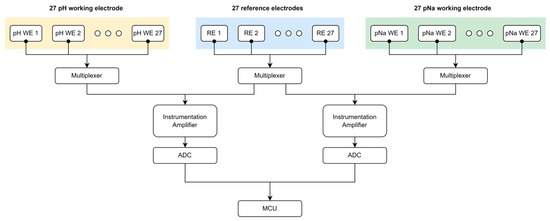 Figure 6 delineates the block diagram of the multi-array electrochemical pH and pNa sensor electrode open-circuit potential (OCP) measurement circuitry which orchestrates data acquisition from a suite of electrochemical sensor electrodes. The electrochemical subset comprises 27 pH and pNa working electrodes (WE), each juxtaposed with a corresponding reference electrode (RE) across a series of multiplexers. These multiplexers facilitate the sequential selection of signals from the WE and RE, routing them through instrumentation amplifiers to bolster signal integrity before conversion by high-resolution analog-to-digital converters (ADCs). The ADCs digitize the amplified signals for subsequent processing by the microcontroller unit (MCU), which governs the multiplexer control logic, data interpretation, and communication protocols.