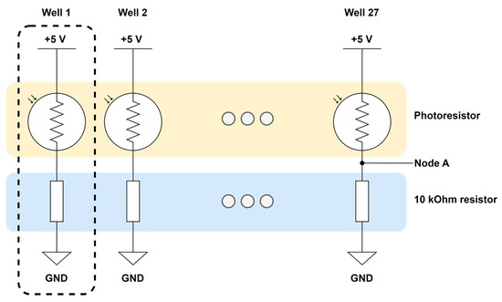 Figure 7 depicts the optical detector voltage divider array for the optical absorbance sensor. Each voltage divider is powered by +5 V and has a photoresistor and a 10k resistor in a voltage divider configuration. There are a total of 27 voltage dividers, one for each well. Voltage measurements are taken from in-between the photoresistor and 10k resistor, noted as Node A in Figure 7. An increase in light intensity on the CdS photoresistor surface would result in a decrease in photoresistor resistance, which in turn would increase the measured voltage at Node A.