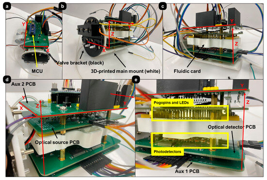 Assembled OBPC development model. (a) MCU ATmega328P on top of the OBPC top board. (b) Black valve bracket and white main mount. (c) Fluidic card and its 3D printed mount sandwiched between the 4 OBPC PCBs. (d) Close-up view of the PCB stack. (e) Side-view of the PCB stack showing the pogo-pin array protruding from the source board and extending down into the fluidic card.