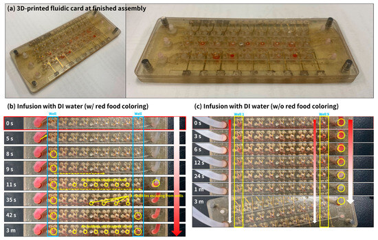 Photograph of assembled fluidic card and flow and leakage test results. (a) Photograph of assembled fluidic card. (b) Timelapse of infusion with DI water with red coloring. (c) Timelapse of infusion with DI water without red coloring.