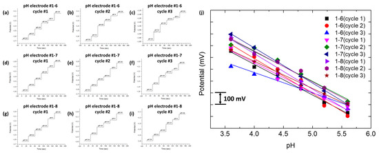 Multi-array pH electrode OCP response. (a–c) pH electrode #1-6. (d–f) pH electrode #1-7. (g–i) pH electrode #1-8. (j) Average and linear fit plot of each pH electrode and cycle.