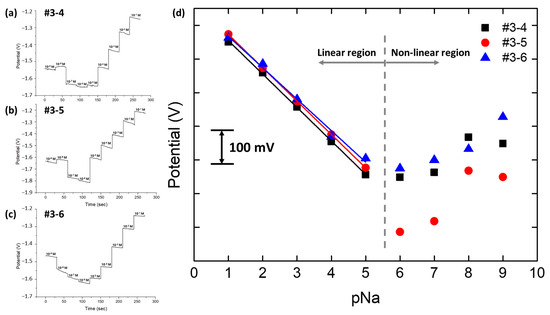 Multi-array pNa electrode OCP response. (a) pNa electrode #3-4. (b) pNa electrode #3-5. (c) pNa electrode #3-6. (d) Average and linear fit plot of each pNa electrode.