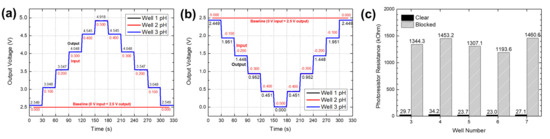 OBPC electrochemical sensor readout circuit output voltage according to (a) positive and (b) negative input voltage. (c) Photoresistor resistance value change depending on whether or not the optical pathway to the photoresistor is blocked.