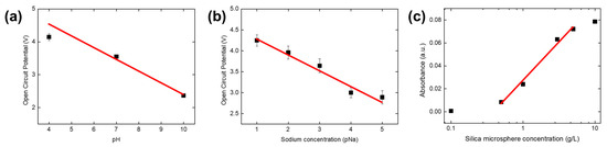 Test results using actual liquid samples. (a) pH sensor output OCP in various pH buffer solutions. (b) pNa sensor output OCP in various sodium chloride concentration solutions. (c) Absorbance sensor output in various silica microsphere dilutions.