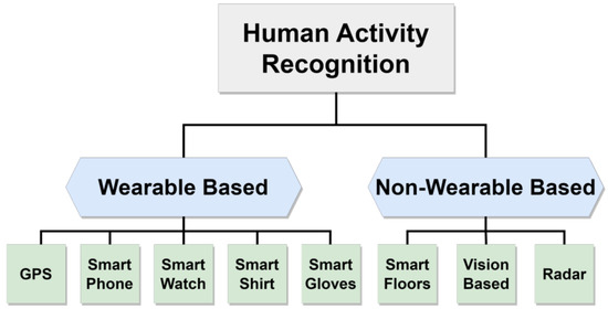 Existing literature in this area often categorizes research based on the features of the devices used, distinguishing between wearable and non-wearable devices, as depicted in Figure 1. Wearable devices encompass smartphones, smartwatches, and smart gloves [26], all capable of tracking human movements. In contrast, non-wearable devices comprise various tools like visual-based systems, intelligent flooring, and radar systems. An illustrative summary of these methodologies is presented in this section, offering a snapshot of the investigations undertaken and a brief overview of diverse applications utilizing these techniques.